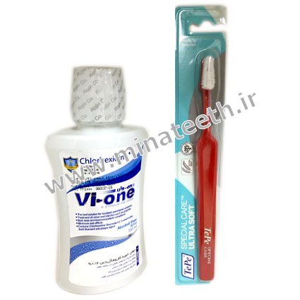 پک جراحی شامل مسواک special care تپه مخصوص جراحی و دهانشویه کلرهگزیدین وی وان است.شما میتوانید این پک را برای استفاده بعذ از جراحی های دندان و دهان از سایت میناتیس تهیه کنید که پک شامل تخفیف نیز میباشد.